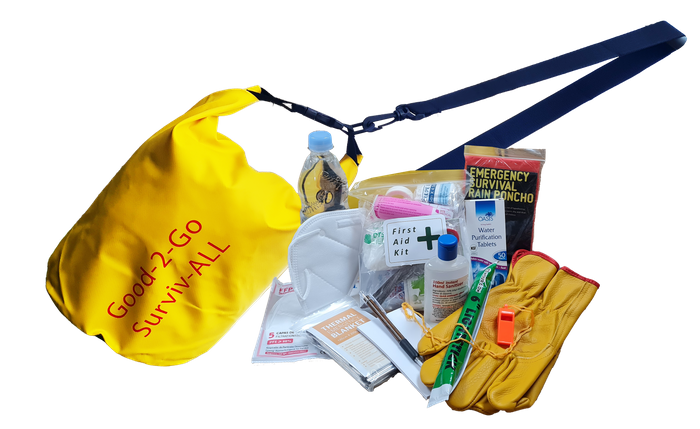 The economy - Good-2-Go 1 Person personal Survival / Civil Defence Kit, is a compact emergency preparedness solution designed to carry, some essentials needed when its our time to survive difficult serious occurrences. These essentials are housed in a drawstring bag that can be carried either in the hand or on the back, Bright Yellow provides signal / indicator function to those who might be on the look out for you. Alerting them quickly if seen and helps you stand out when it counts. See list of contents to work out if the economy - Good-2-Go 1 Person personal Survival / Civil Defence Kit meets your needs.