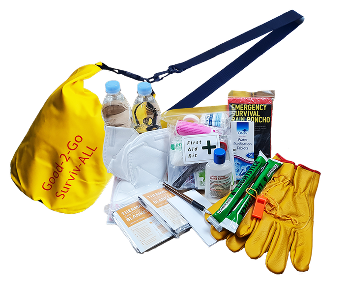 The economy - Good-2-Go 2 Person personal Survival / Civil Defence Kit, is a compact emergency preparedness solution designed to carry, some essentials needed when its our time to survive difficult serious occurrences. These essentials are housed in a drawstring bag that can be carried either in the hand or on the back, Bright Yellow provides signal / indicator function to those who might be on the look out for you. Alerting them quickly if seen and helps you stand out when it counts. See list of contents to work out if the economy - Good-2-Go 2 Person personal Survival / Civil Defence Kit meets your needs.