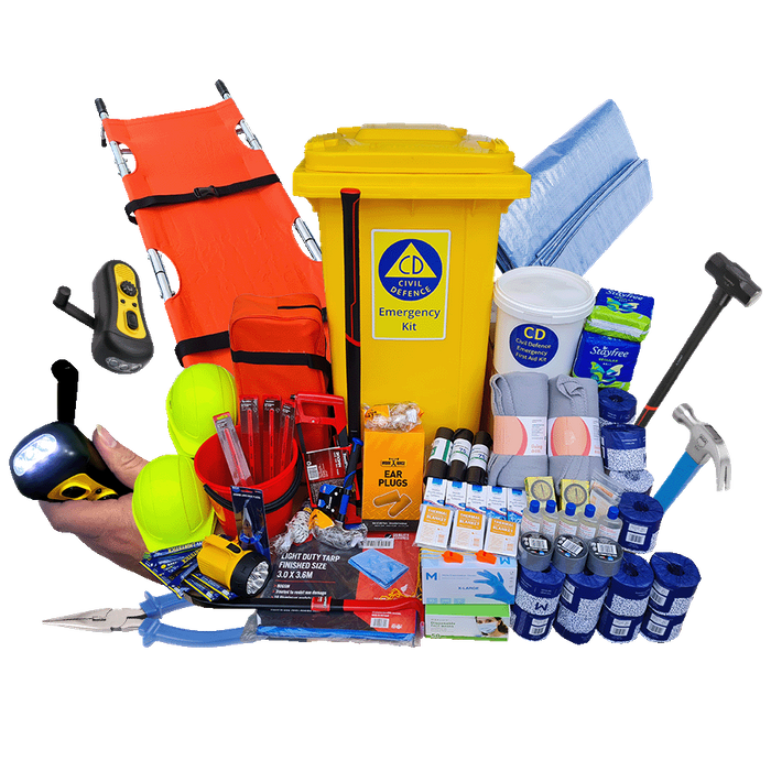 Good-2-Go Civil Defence Survival Kit – 240 L Wheelie Bin (Up to 20 People) A comprehensive emergency response kit designed to support up to 20 people in a civil defence or disaster situation. Supplied in a large 240 L wheelie bin for mobility and protection, this kit includes an extensive range of essential items such as first aid supplies, basic tools, lighting, stretcher, and protective equipment — all designed to assist in survival and response efforts. Compact, organised, and ready to roll when emergencies strike. (Note: food and water not included.)