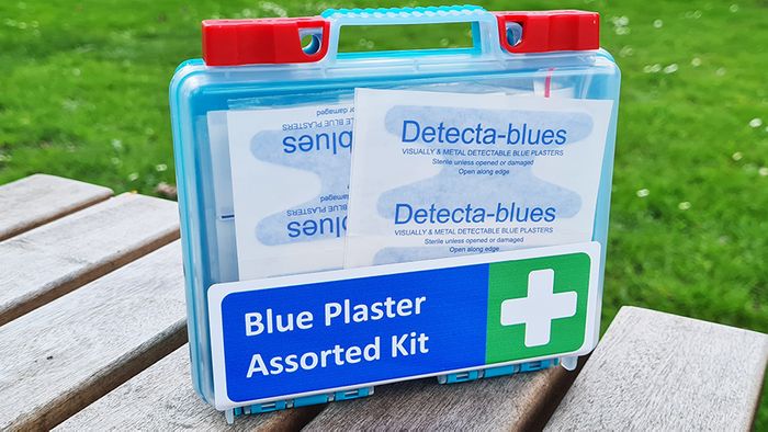 So it would be a great idea if the blue plasters weren't only stored in the food industry first aid kit, so that when your in a hurry and don't want to open the whole kit just for a small cut, blue kitchen plasters were readily at hand, standing on a shelf close by perhaps well have we got the right item for you, a small compact first aid kit containing an assortment of blue plasters. Designed and assembled in Wanganui, New Zealand. This kit includes a selection of metal-detectable blue plasters, making it ideal for kitchens/food industry. The compact plastic kit measures 15 x 14 x 4.5 cm, top up when necessary.