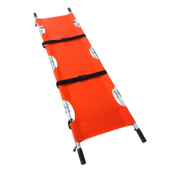 Quarter Folding Aluminium Pole Stretcher – Compact. This cleverly designed stretcher folds down into roughly a quarter of its full size for maximum portability. Once set up, the frame locks tight for a secure, platform to support patient transport. Constructed from lightweight aluminium with a durable fabric bed, it includes two restraint straps and packs neatly into a compact carry bag. Ideal for emergency response teams, civil defence, and confined-space rescues. Open: 208 x 55 x 13cm | Folded: 61x25x14cm | Gross weight: 11kg