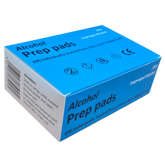 - Alcohol Prep Pads 70% Alcohol 6cm x 6cm Folded Wipe box of 200