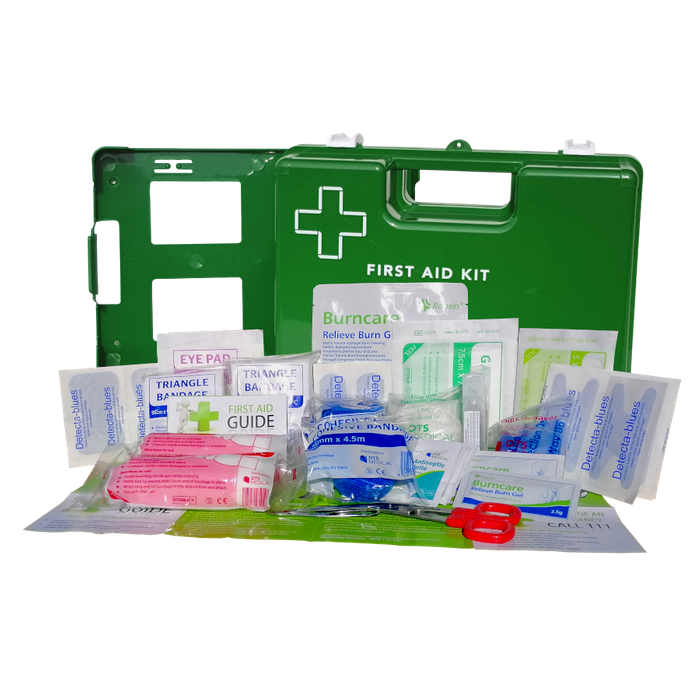 First Aid Kits – Food Industry Range A specialised range of first aid kits designed for use in food preparation and processing environments. Each kit includes blue detectable plasters and a selection of quality first aid supplies suitable for handling most workplace injuries. Available in a variety of sizes and container types — from compact soft packs to wall-mounted boxes — to suit different work areas and compliance needs. Built for hygiene, visibility, and practicality, Designed and assembled in Wanganui, New Zealand, Measuring approximately 27 x 19 x 12 cm