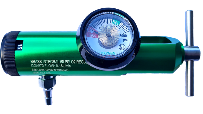 Oxygen flow control regulators are pressure-reducing devices that decrease the oxygen pressure from a cylinder to a safe, usable level. These regulators are designed for administering oxygen to patients who require elevated oxygen levels to enhance their breathing conditions. 12 Preset Flow Settings Precisely adjust the oxygen flow rate to meet the patient's specific needs during therapy. Choose effortlessly between 12 preset flow settings: 0, 0.5, 1, 1.5, 2, 3, 4, 5, 6, 8, 10, and 15 LPM. Compact, Lightweight, & Reliable This durable regulator is crafted from lightweight anodized aluminium with brass high-pressure conduits. It features easy-to-read gauges that display the LPM setting and the oxygen cylinder's capacity, ensuring you know when a refill is needed.