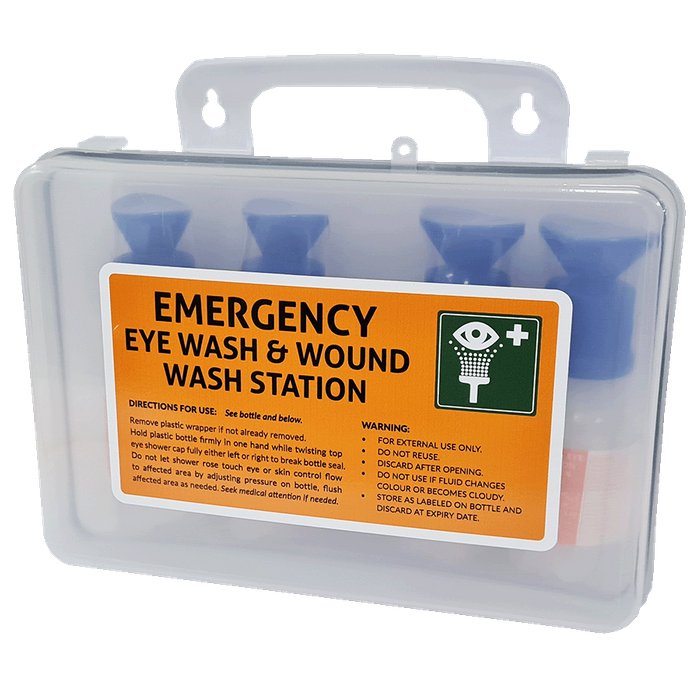 Handy eye wash station with 4 100ml ready to use eye wash bottles, the advantage of this station is that it has 4 bottles, of a lower amount of fluid for smaller needs, but helps with waiting on restocking as there is 4 in the kit
